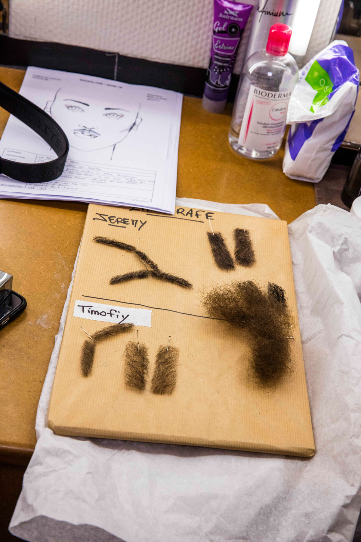- Une fiche maquillage/coiffure est réalisée pour chaque artiste entrant sur scène. Au premier plan, les fausses moustaches et les sourcils que vont porter les danseurs Timofy et Jeremy. (© Vincent Gire / Milan Presse).