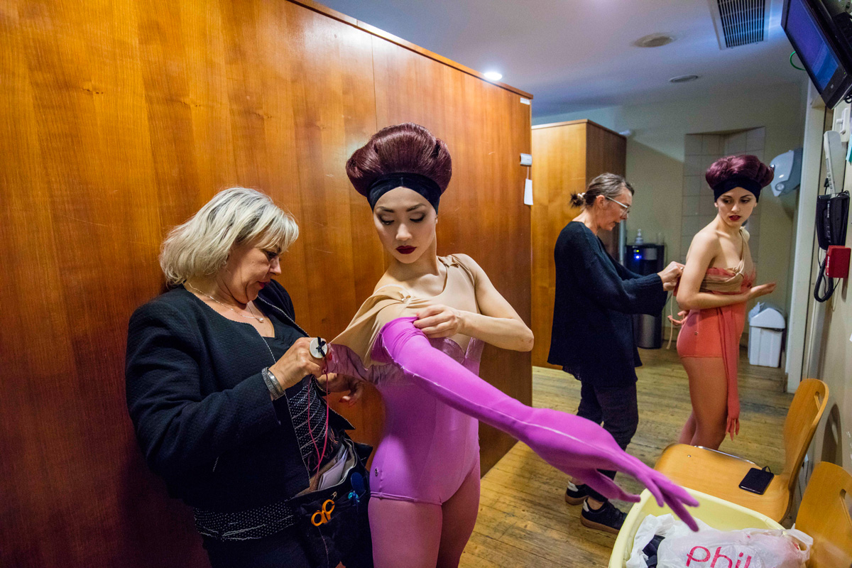 La perruque est assortie d’un bandeau qui permet de bien la maintenir sur le crâne. On le devine ici sur la tête de cette danseuse. (© Vincent Gire / Milan Presse).