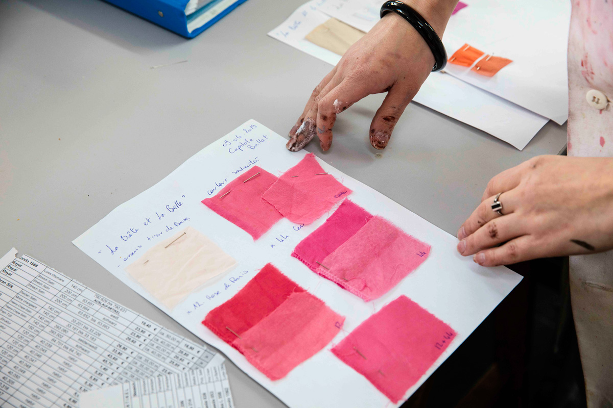 - Laurie doit trouver les couleurs qui se rapprochent le plus des échantillons de tissus que les couturières lui ont transmis. (© Vincent Gire / Milan Presse).