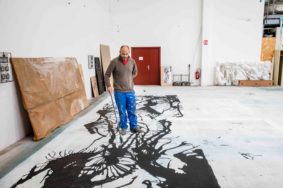 - Une fois le décor construit, il faut le peindre en respectant le projet de l’artiste qui l’a conçu au départ. Les pinceaux utilisés sont munis de longs manches permettant de travailler debout en marchant sur la toile fixée au plancher. (© Vincent Gire / Milan Presse).