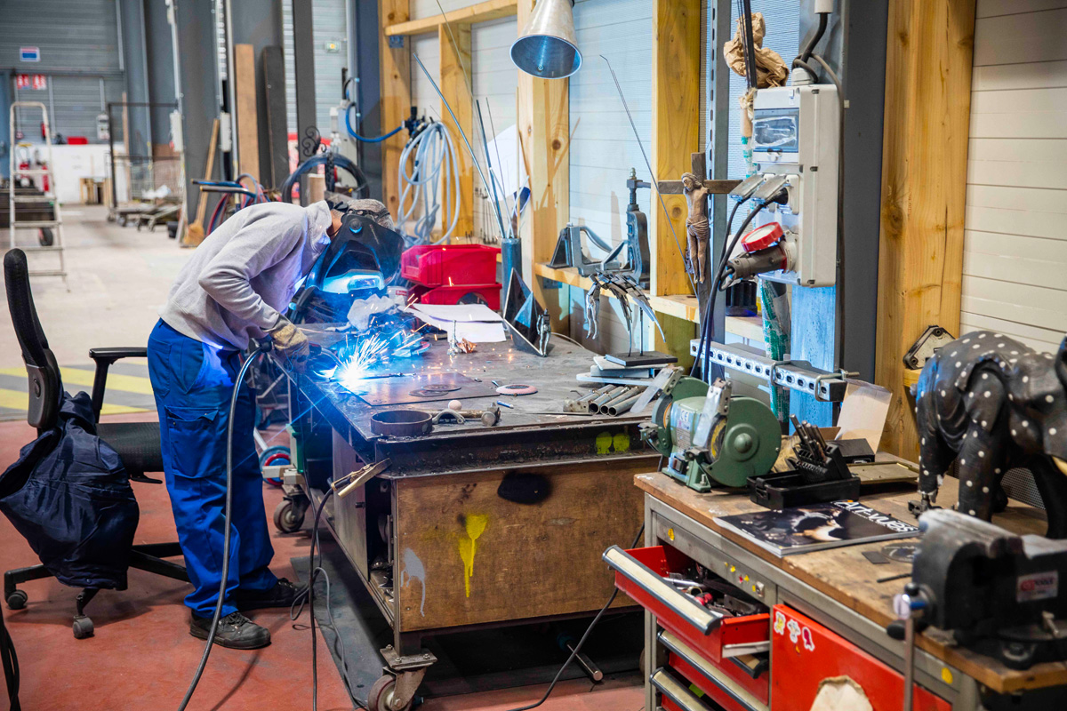 - Dans l’atelier « serrurerie » sont fabriquées toutes les pièces métalliques : de simples roulettes ou… des escaliers capables de supporter le poids de plusieurs chanteurs ou danseurs ! (© Vincent Gire / Milan Presse).