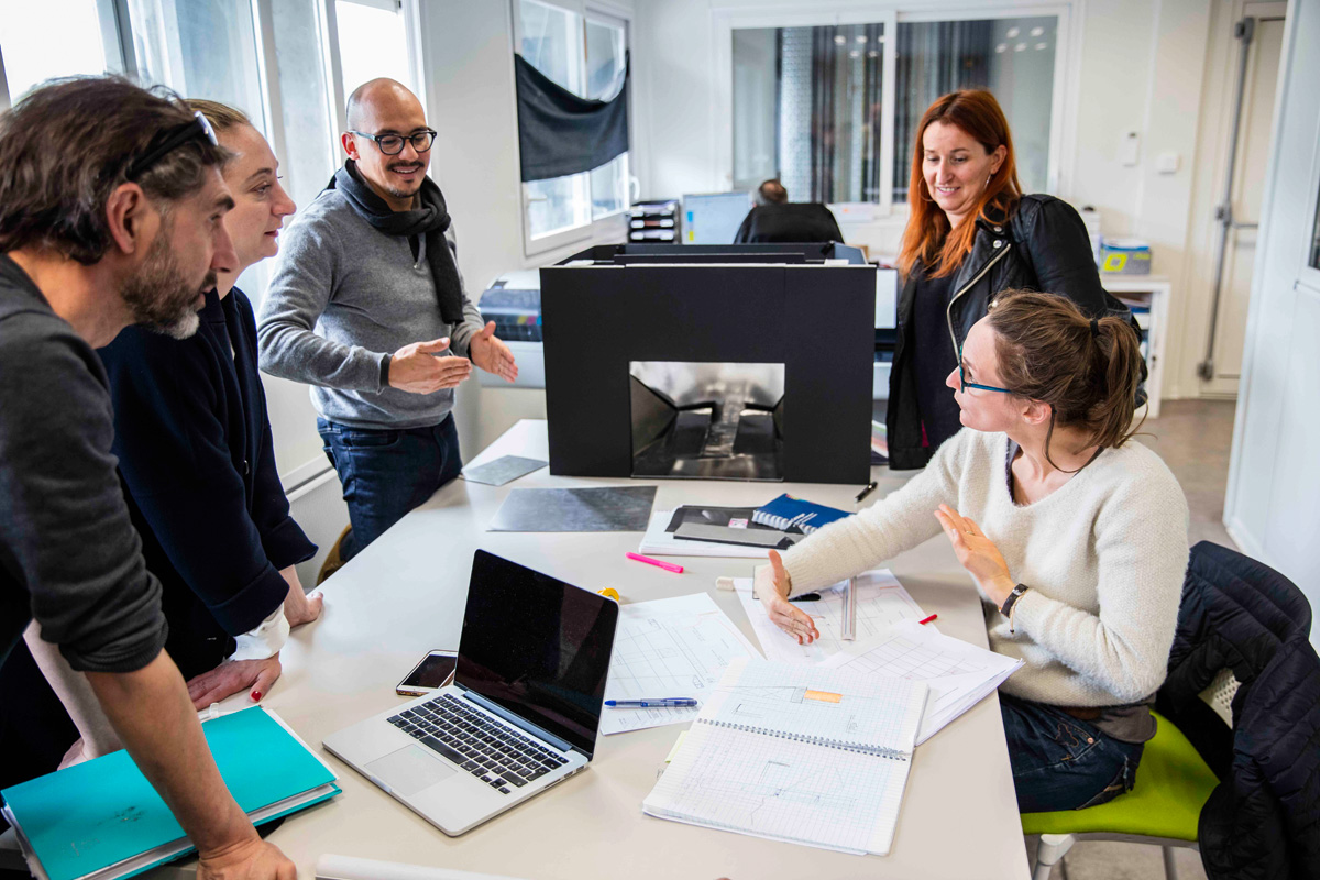 - La maquette, que l’on voit ici en bout de table, est l’une des toutes premières étapes dans la réalisation d’un décor. C’est une base qui permet de mesurer les contraintes qu’il faudra surmonter pour réaliser le décor grandeur nature. Laura (en pull blanc) est l’ingénieure qui effectue les calculs pour voir ce qu’il est possible de faire… ou non ! (© Vincent Gire / Milan Presse).