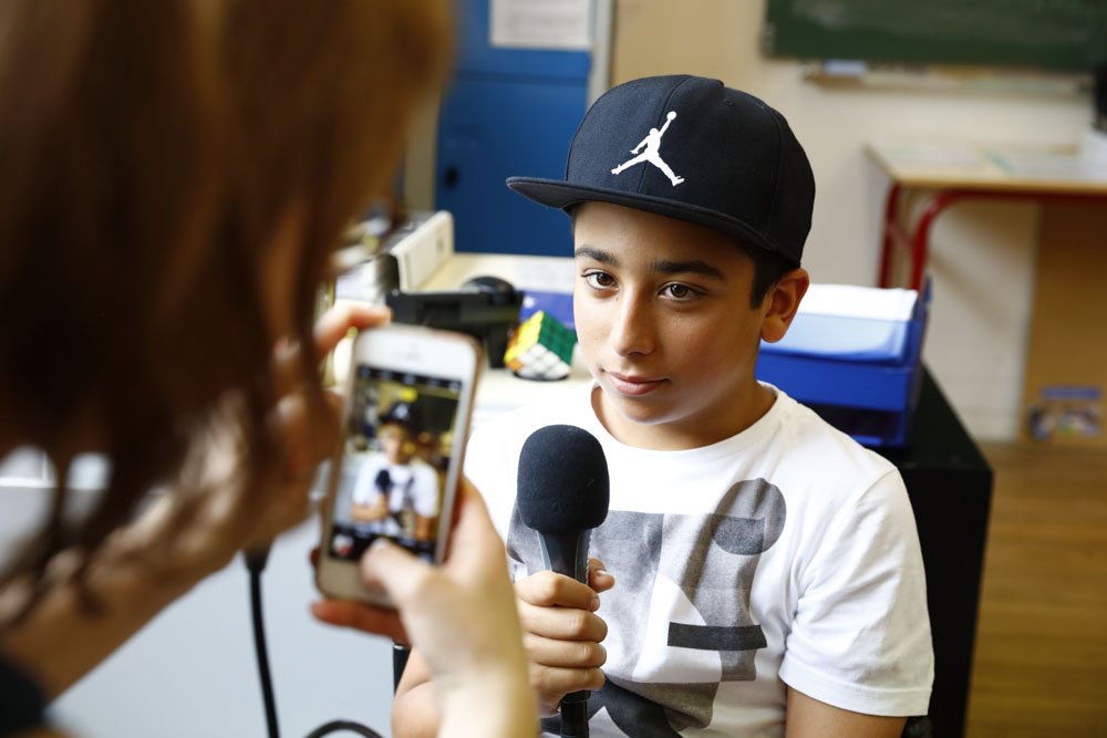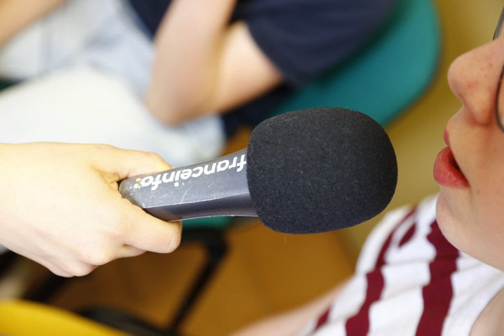 Les p’tits journalistes s’entraînent à parler au micro avant de poser leurs questions aux spécialistes. © Vincent Gire / Milan presse