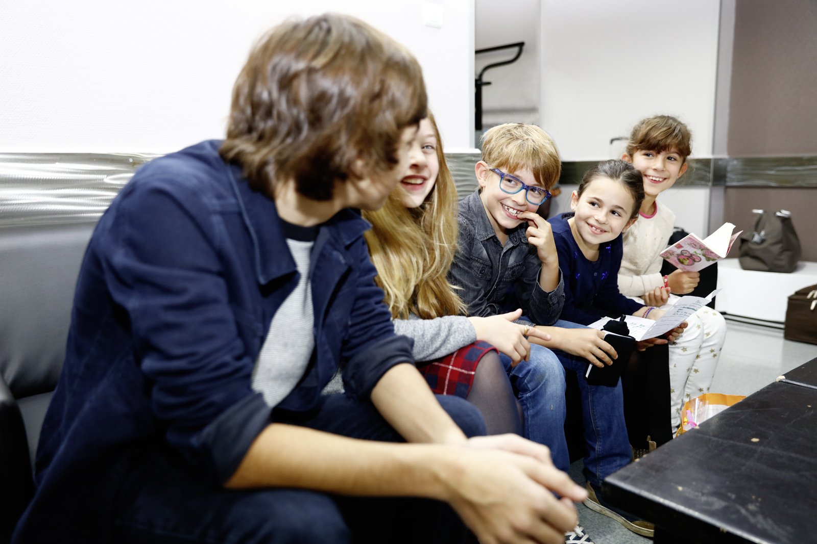 Une heure avant le concert, la fine équipe de journalistes débarque en trombe dans les coulisses. Le contact entre les enfants chanteurs et les enfants reporters est immédiat : tout le monde se fait la bise !
