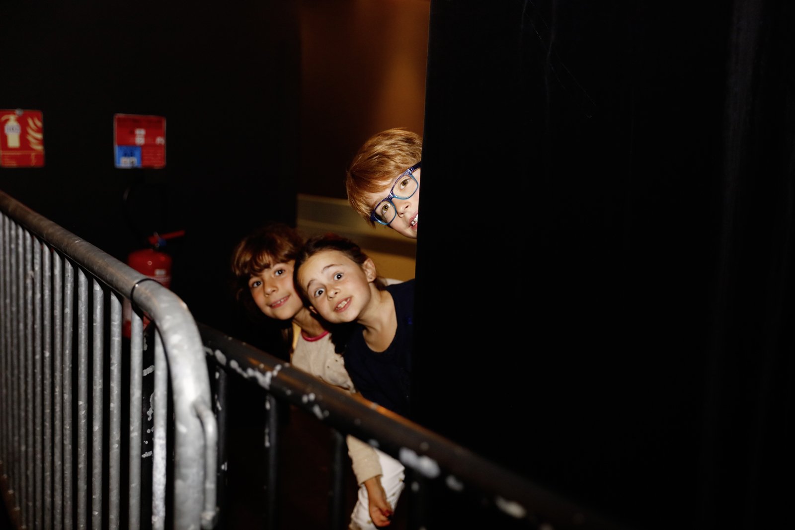 - Les trois p’tits reporters se cachent derrière le rideau noir qui sépare les coulisses de la salle de concert du Zénith : eh oui, retour à la réalité ! Il faut rejoindre les milliers d’enfants qui sont en train de s’installer. (© V. Gire / Milan presse)