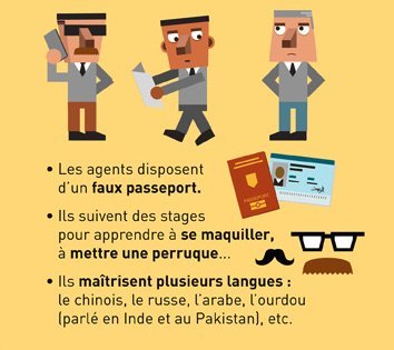 Quand ils sont dans des pays étrangers, les espions ne doivent pas se faire remarquer. Ils utilisent une fausse identité, font semblant d’avoir un métier : c’est ce qu’on appelle une « couverture ». Ils parlent bien sûr la langue du pays où ils sont envoyés. Lors de leur entraînement, ils apprennent aussi à se déguiser très rapidement pour échapper à des personnes qui les reconnaîtraient.