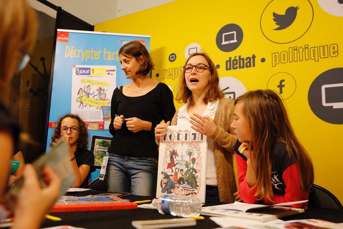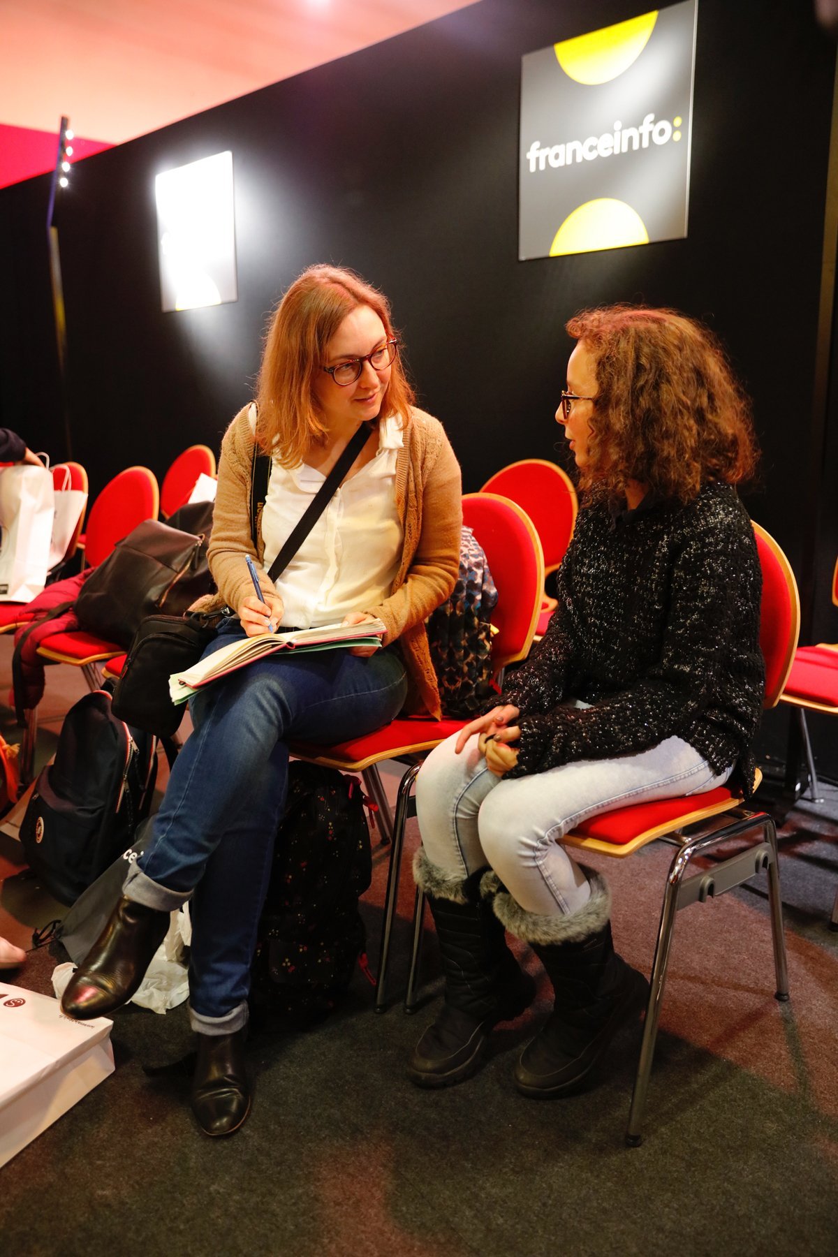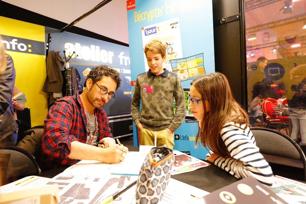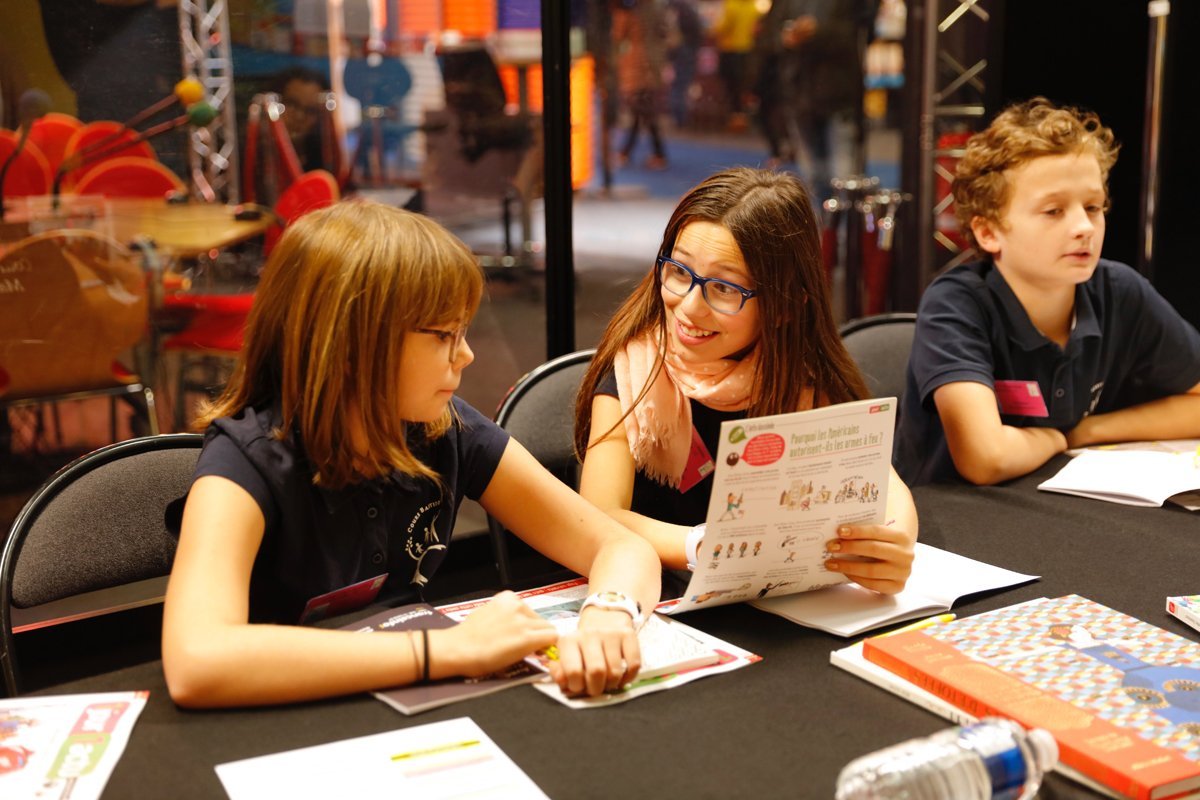 Grâce au travail qu’ils mènent à l’école autour des médias, ils ont été sélectionnés pour être les p’tits journalistes du jour. Les 8 élèves du club lecture du collège Cours-Bastide, à Marseille, ont eu le privilège d’interviewer eux-mêmes un écrivain, Thomas Scotto, et une illustratrice, Charlotte Gastaut, lors du Salon du livre et de la presse jeunesse, à Montreuil. Ils se sont levés à 4 h 30 mais « ils ne sont pas fatigués du tout« , nous rassurent-ils en arrivant dans le studio-atelier de France Info, installé au 1er étage du salon.
