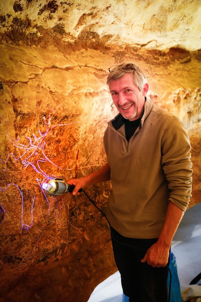 - Gilles Lafleur est l’un des artisans qui ont réalisé, une à une, les gravures dans le fac-similé de Lascaux. Sur l’une des parois reconstituées, il révèle, à la lumière noire, les gravures qui seraient autrement invisibles. © Vincent Gire / Milan presse