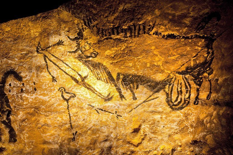 - La peinture la plus intrigante de la grotte n’a été reproduite que dans le musée. En effet, impossible de la voir dans le fac-similé, car elle est peinte au fond d’un puits de 5 mètres de profondeur, première bizarrerie ! Attaqué par un bison en train de mourir, le seul homme représenté à Lascaux a une tête d’oiseau… Étrange ! © Philippe Roy / Aurimages / AFP