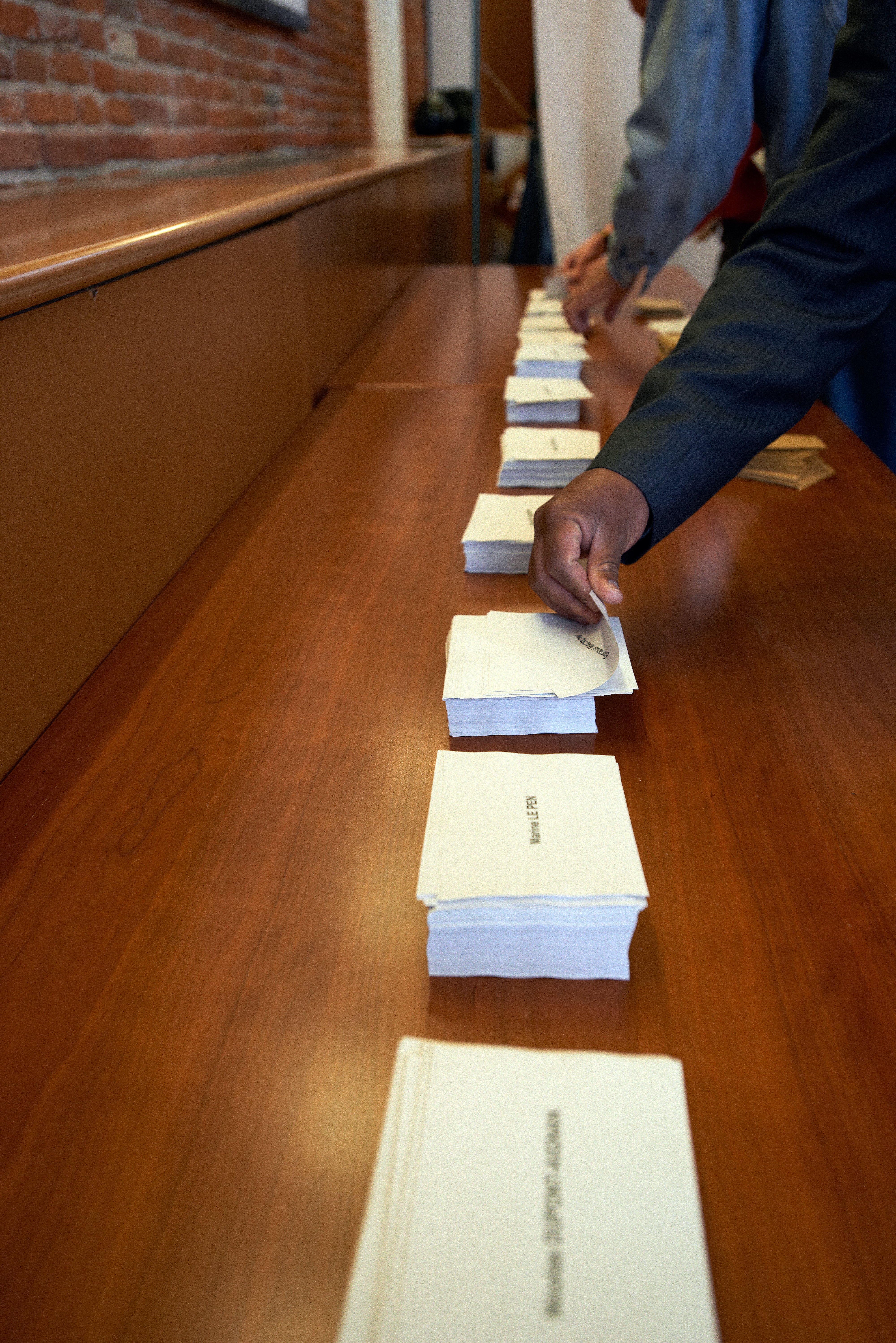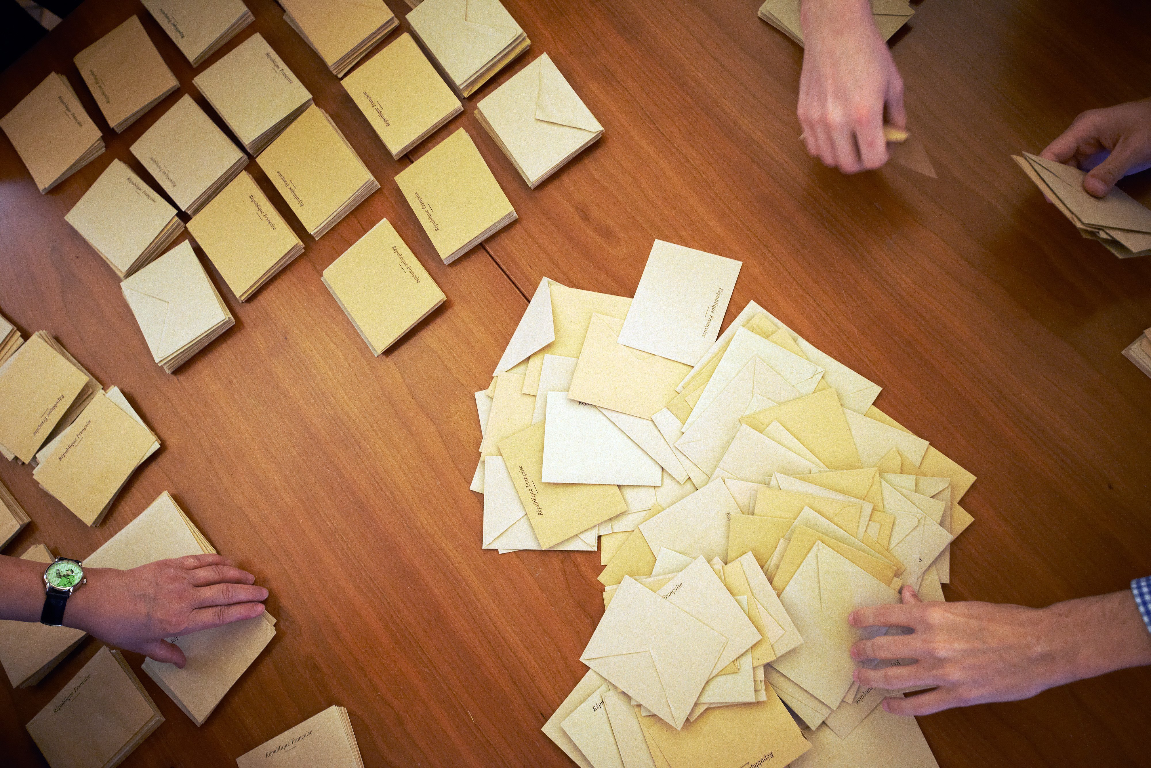 - Une fois l’urne ouverte, les bulletins sont rassemblés par paquets de 10. © Alain Pitton