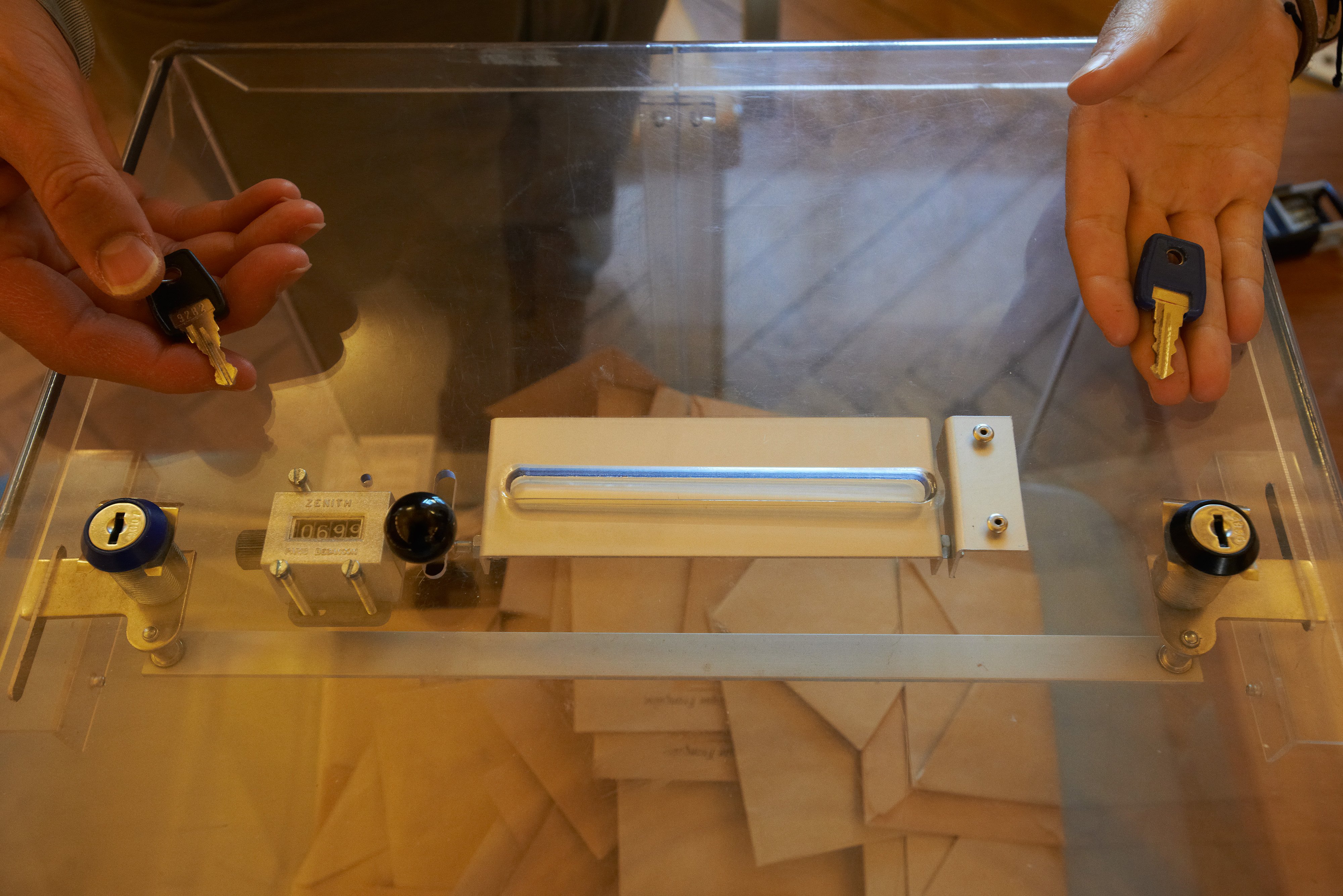 - Le président et la secrétaire gardent chacun l’une des deux clés qui permettent d’ouvrir les serrures de l’urne. © Alain Pitton