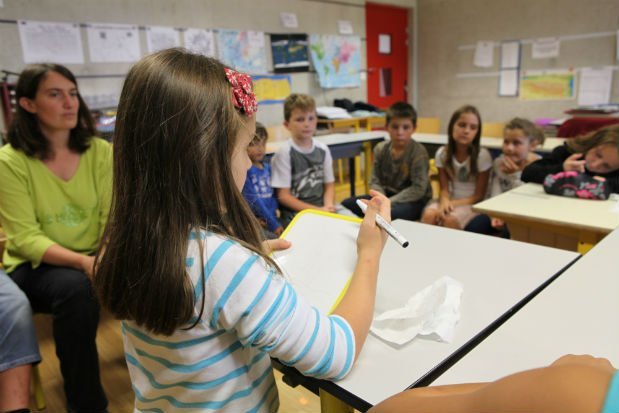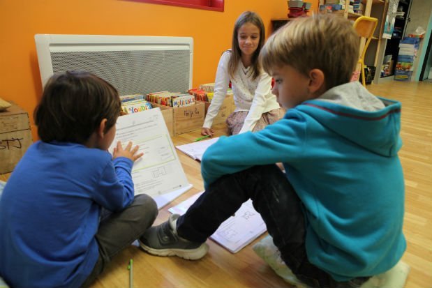 Après le « Quoi de neuf ? », place aux maths. Mais aujourd’hui pas question de réciter une table de multiplication ou de recopier une leçon sur les divisions. Il y a quelques jours, les élèves sont partis faire une balade mathématique dans le village. Équipés de lunettes mathématiques imaginaires, les élèves ont relevé tout ce qui leur faisait penser à des maths. Aujourd’hui, ils étudient l’une de leurs trouvailles : une plaque d’immatriculation. Et voilà l’occasion de différencier un carré d’un rectangle, de faire des multiplications, des soustractions, des opérations à trous… Dans une classe Freinet, toute expérience est bonne pour apprendre. Et tout le monde met la main à la pâte ! Car ici, la participation et la coopération sont essentielles. Plus tard dans la matinée, chaque élève est chargé de reprendre son plan de travail, un programme d’exercices pour 15 jours. Les exercices et les objectifs changent en fonction de la progression de chacun. Quand les enfants ont terminé leur travail et qu’ils ont atteint un certain niveau dans une matière, ils peuvent aider leurs camarades. Casey, arrivée à la rentrée dans l’école, apprécie cette nouvelle organisation : « J’aime bien aider les autres à apprendre. On ne faisait pas ça dans mon ancienne école. » Et la coopération est bénéfique pour tout le monde, celui qui est aidé… mais aussi celui qui aide ! « L’enfant qui explique à l’autre devient expert », insiste Agnès Ciarapica.