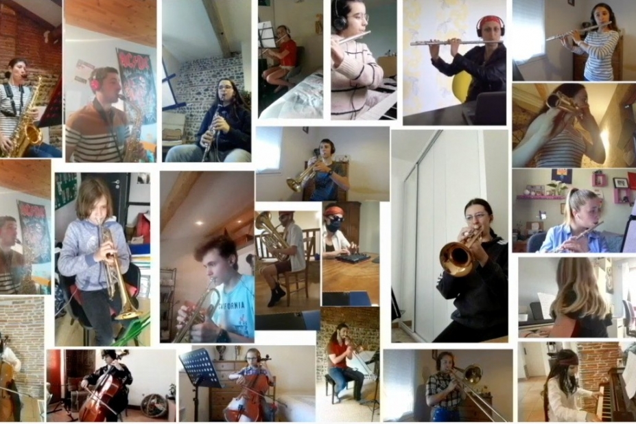 Et pour continuer à jouer tous ensemble, Bérénice Labaysse, la chef de l’orchestre de l’école de musique, a eu l’idée de rassembler virtuellement les musiciens. Beaucoup d’orchestres ont eu recours à la vidéo pour partager leur musique et adoucir le confinement. « J’ai proposé aux musiciens un challenge : que chacun se filme en jouant sa voix (son instrument). Pour avoir l’impression de jouer les uns avec les autres et se caler sur le bon rythme, chacun devait jouer en écoutant dans son casque ou ses écouteurs le morceau interprété par un orchestre. »