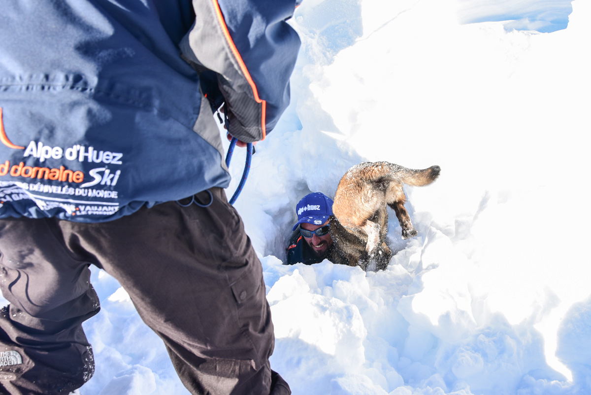 Pour entraîner Ollie, un collègue d’Arnaud s’est caché sous la neige. En quelques minutes, Ollie l’a retrouvé ! (© Baptiste Diet/Alpes d’Huez tourisme)