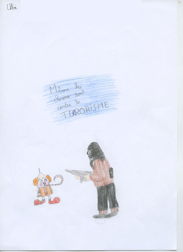 Quand j’ai appris ça, j’ai eu très peur et je me suis dit : il ne faut pas avoir peur d’eux. Ils pensent qu’ils font des choses bien mais ce n’est pas vrai. Il faut avoir le sens de l’humour et rigoler. On a le droit en France, ils sont français et ils le savent. En plus, ils ont fait 17 morts et il y a des gens qui tenaient à ces personnes. J’adore Charlie Hebdo. Je suis Charlie.