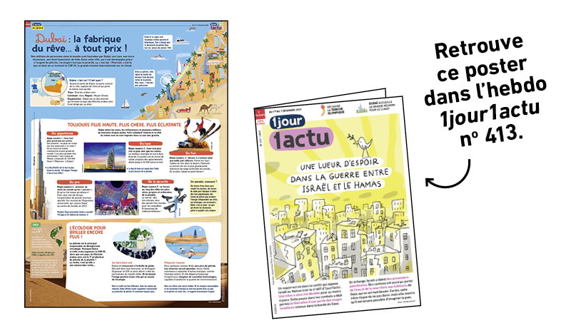 Si tu es abonné au journal papier 1jour1actu, découvre le grand poster à déplier sur Dubaï et les raisons pour lesquelles cette ville accueille la COP cette année.