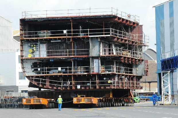 - Les immenses blocs de l’A34 (Harmony of the Seas) sont déplacés à l’intérieur du chantier naval, comme ici en juillet 2014. (B. Biger/STX Europe)