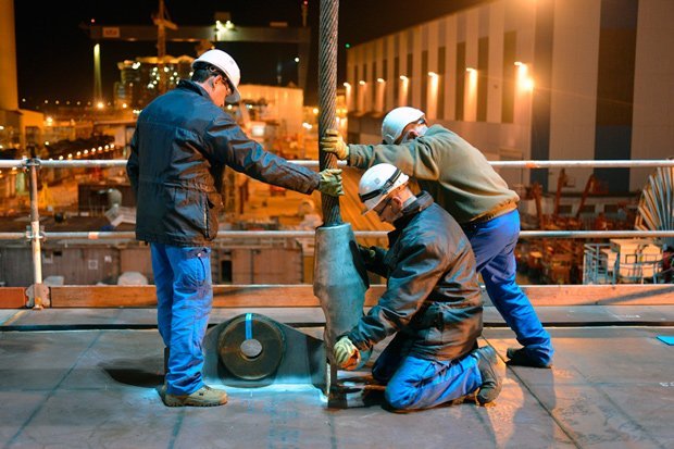 - Les ouvriers travaillent sur le pont du bateau, et posent un câble destiné à soulever une lourde charge. (Bernard Biger, STX France)