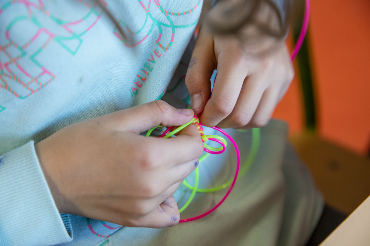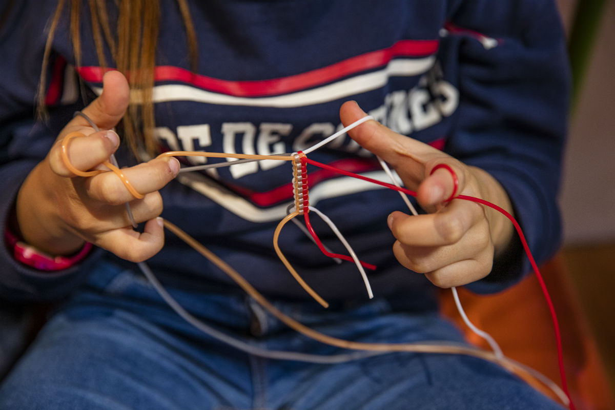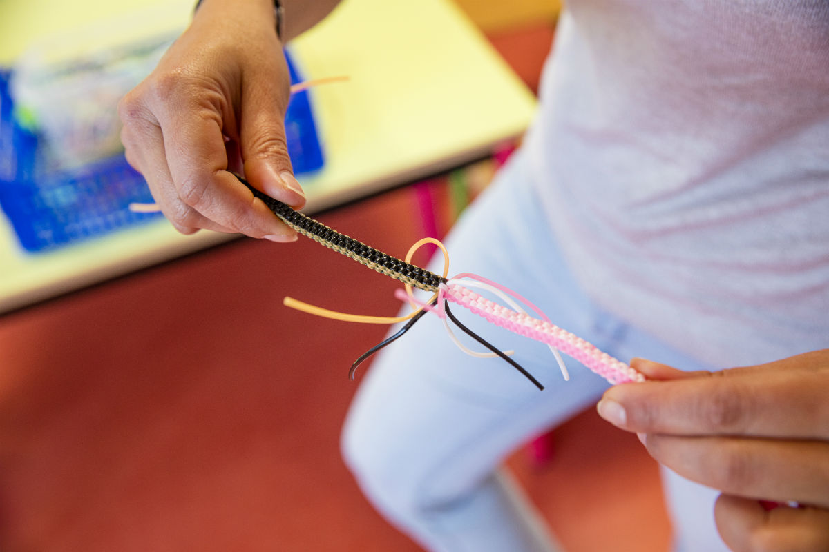Gwenn, l’animatrice, attache les scoubidous avec un nœud spécial. (© Vincent Gire)