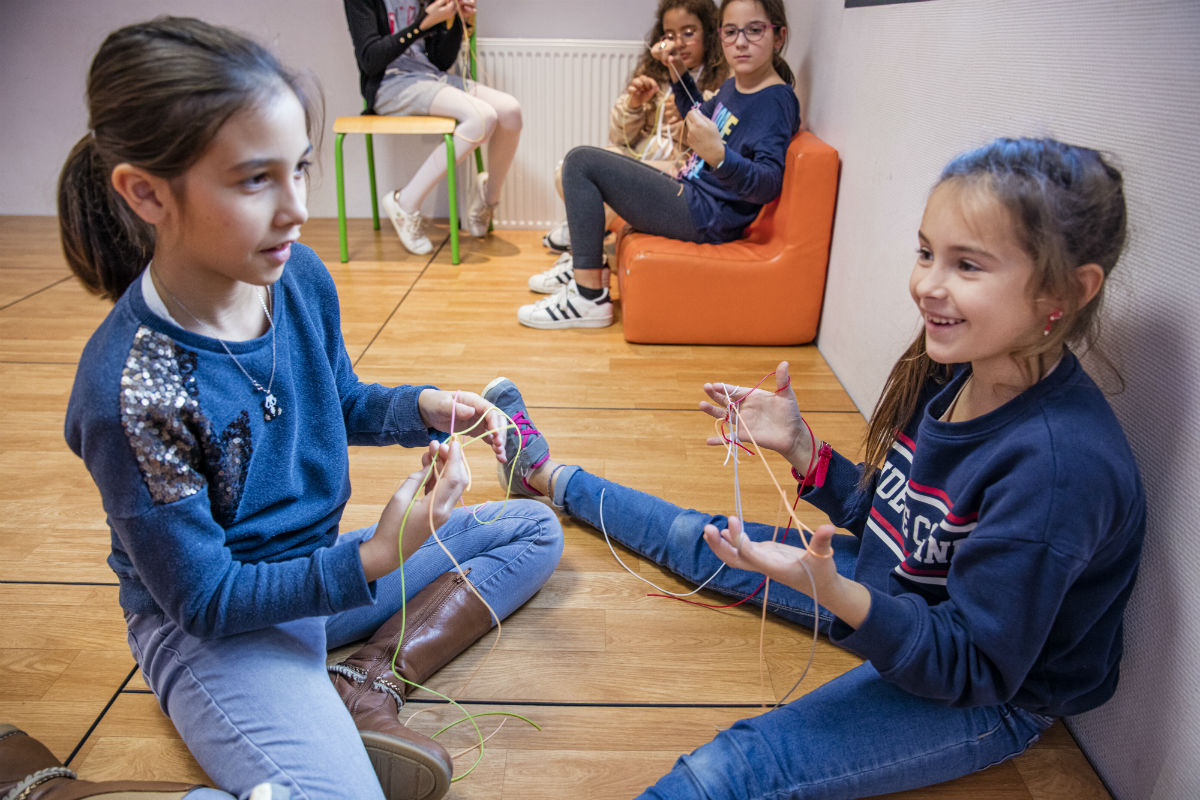 Ella, Maëlle, Janelle, Adria et Clara papotent pendant l’atelier « scoubidou ». (© Vincent Gire)