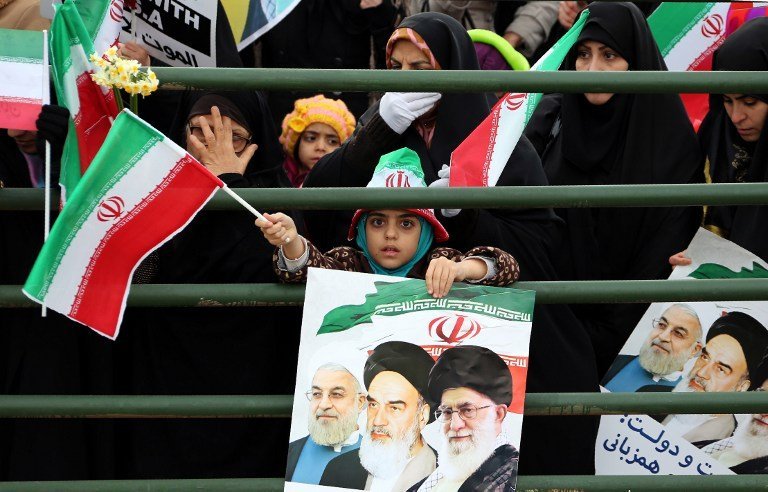 - À l’occasion de l’anniversaire de la Révolution iranienne, cette fillette agite le drapeau iranien et porte une affiche représentant le président Hassan Rohani (à gauche), l’ancien Guide suprême l’ayatollah Khomeiny (au centre), et l’actuel Guide suprême l’ayatollah Ali Khamenei (à droite). C’est lui, et non le Président, qui détient tous les pouvoirs. © AFP / ATTA KENARE