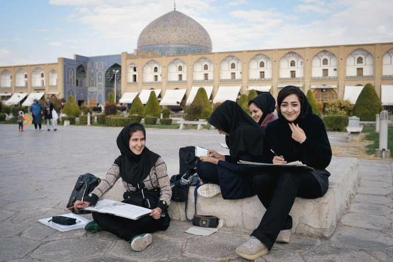 - Des étudiants devant la mosquée royale d’Ispahan, l’un des plus beaux monuments religieux d’Iran. Elle est couverte de magnifiques céramiques bleues. © AFP