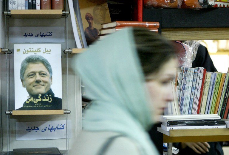 - Dans la vitrine d’une librairie, le livre de l’ancien président des États-Unis Bill Clinton rédigé en farsi, la langue persane, principale langue parlée en Iran. © AFP / BEHROUZ MEHRI