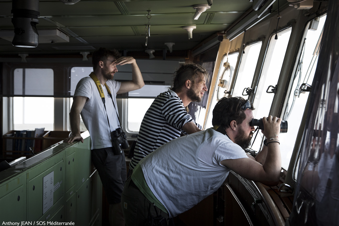 - Lorsque l’Aquarius est en mer, Nick et son équipe scrutent l’horizon avec des jumelles pour repérer les bateaux de migrants. Certaines fois, ce sont des avions militaires européens survolant la Méditerranée qui aperçoivent les bateaux à secourir. Dans ce cas, les pilotes des avions préviennent l’Aquarius et lui demandent d’intervenir. (© Anthony Jean/SOS Méditerranée.)
