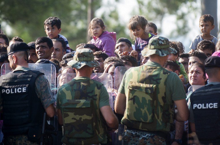 - À la frontière entre la Grèce et la Macédoine, des migrants attendent, derrière un mur de policiers, de pouvoir entrer en Macédoine. © Robert Atanasovski/ AFP
