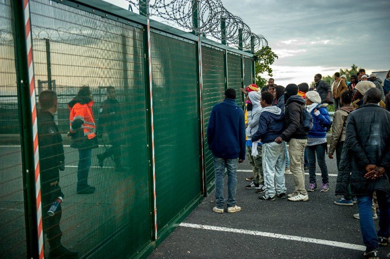 - Derrière un mur de barbelés, des gendarmes français empêchent les migrants d’accéder à l’Eurotunnel, le train sous la Manche qui permet de rejoindre le Royaume-Uni. © Philippe Huguen/ AFP