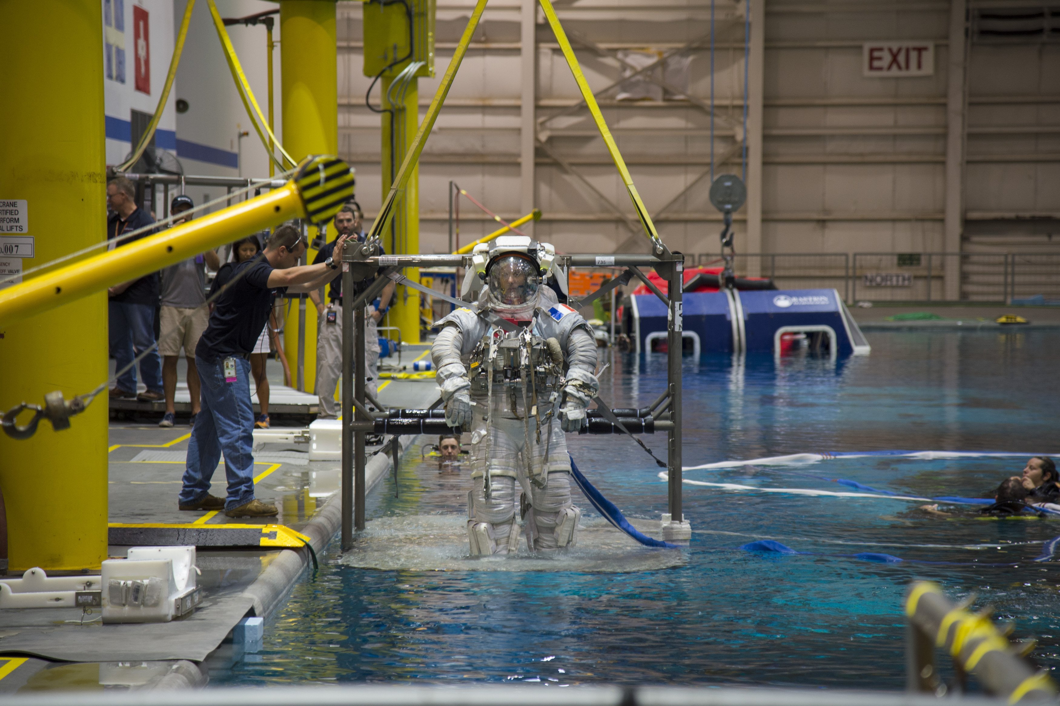 - Dans une grande piscine, où l’eau simule l’état d’apesanteur, Thomas s’entraîne aux sorties hors de l’ISS. © ESA–Stephane Corvaja, 2016