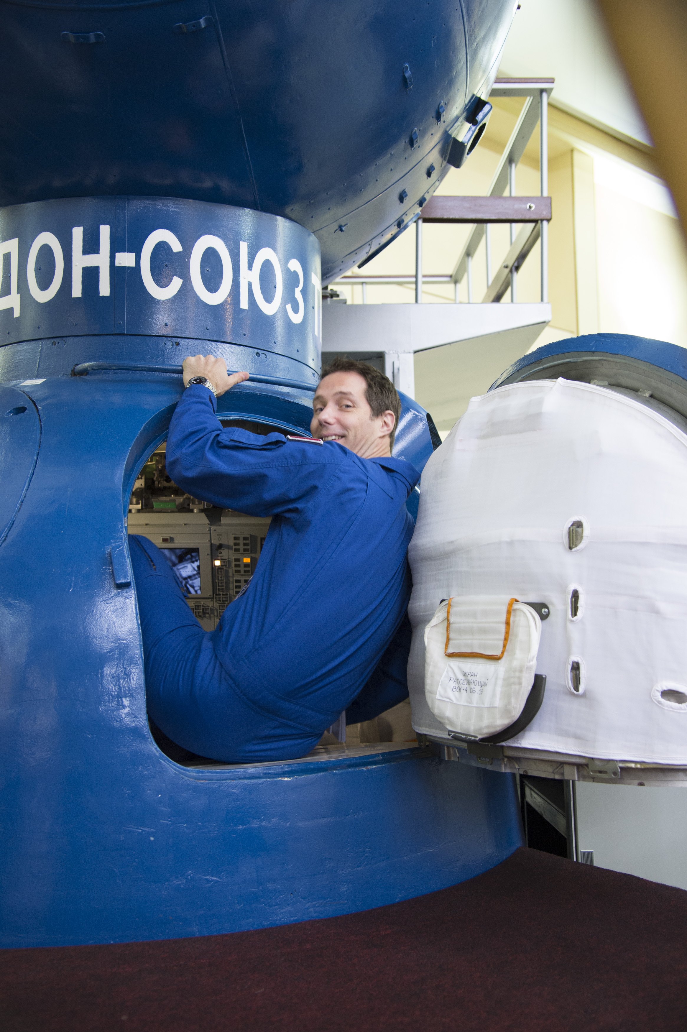 - Thomas entre dans un simulateur du vaisseau Soyouz, lors d’un entraînement près de Moscou, en Russie. © ESA–Stephane Corvaja, 2016