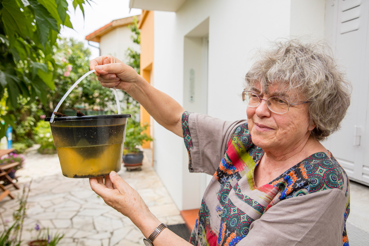 - Isabelle montre son piège à larves. C’est un récipient rempli d’eau stagnante qui attire les moustiques. (© Vincent Gire/Milan presse)