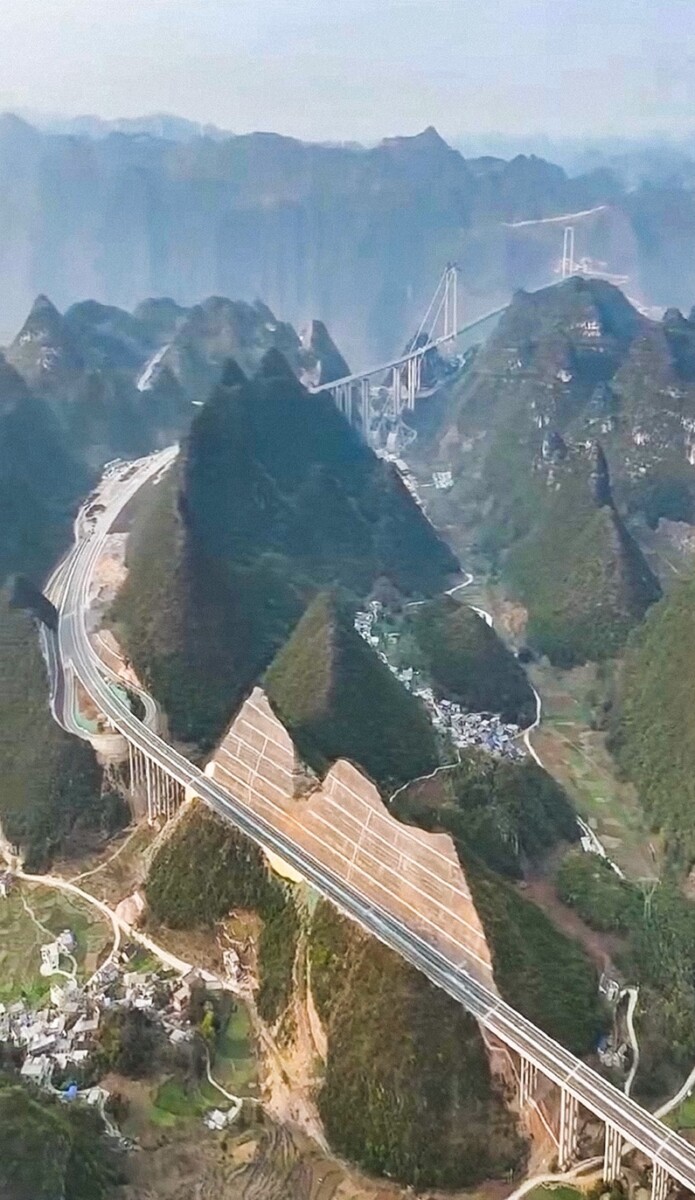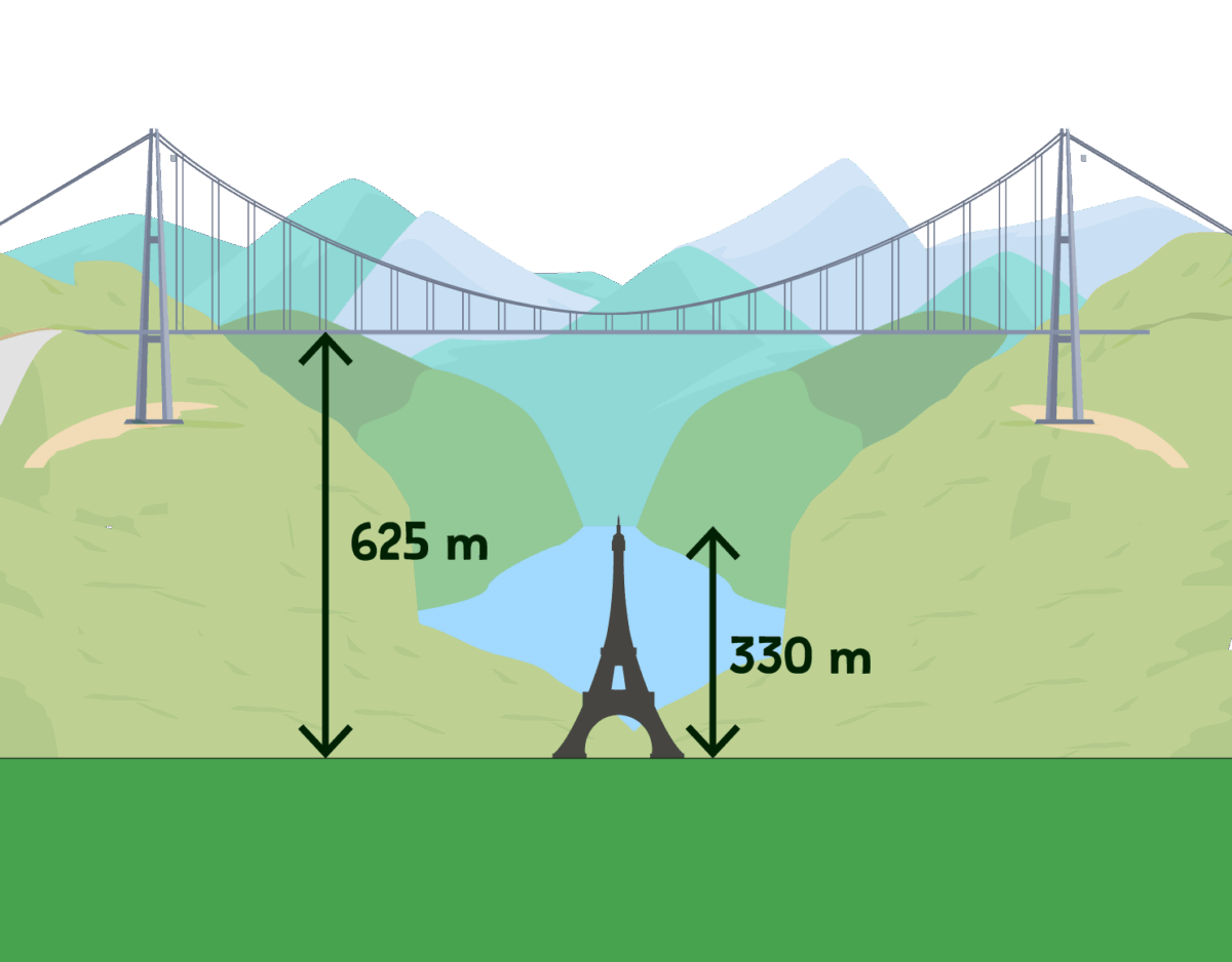 C’est la hauteur du tout nouveau pont Beipanjiang. C’est un pont suspendu, cela veut dire qu’il tient accroché à des câbles très résistants, eux-mêmes tenus par deux tours très solides. 565 mètres de haut, ça correspond à un peu moins de deux tours Eiffel !