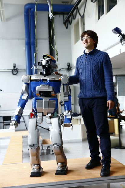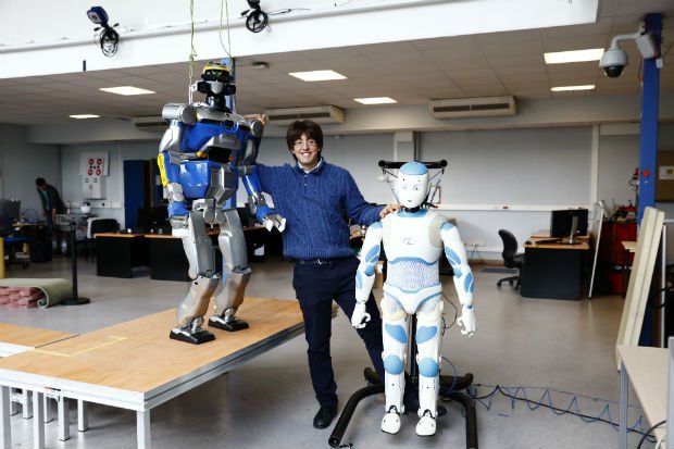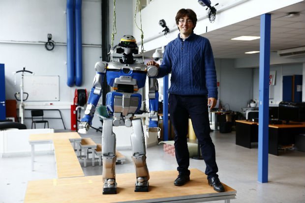 - Nicolas, chercheur en robotique, pose avec deux robots : HRP-2, debout sur la table, et Roméo. (Vincent Gire / Milan Presse)