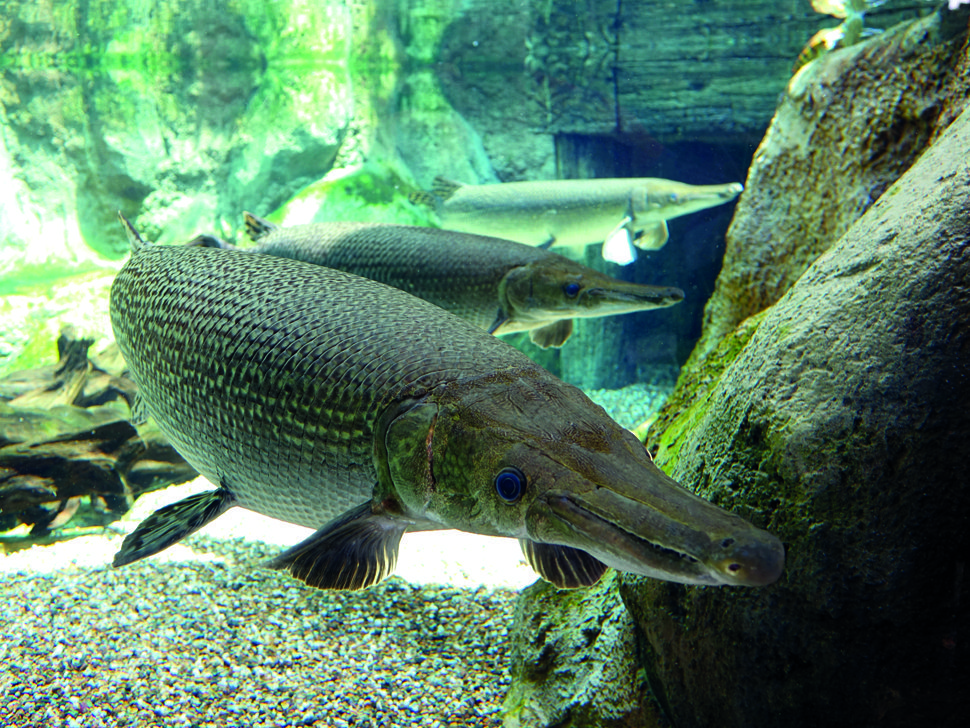 - Le garpique-alligator ou poisson-alligator. Aquatis est allé chercher ces poissons dans un aquarium à Singapour, en Asie. Certains spécimens peuvent faire jusqu’à 1, 20 mètre. Le voyage jusqu’à Aquatis a été un veritable casse-tête ! Avec leurs dents, ces poissons sont capables de percer les énormes poches plastiques gonflées d’eau utilisées pour les transporter. (© Aquatis.)