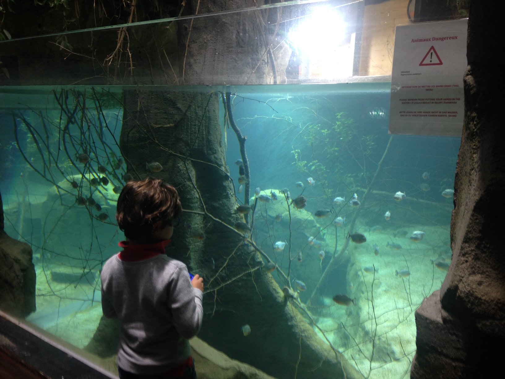- Sur la vitre du bassin des piranhas, une pancarte prévient : Animaux dangereux, interdiction de mettre les mains dans l’eau. (© A.barber.)