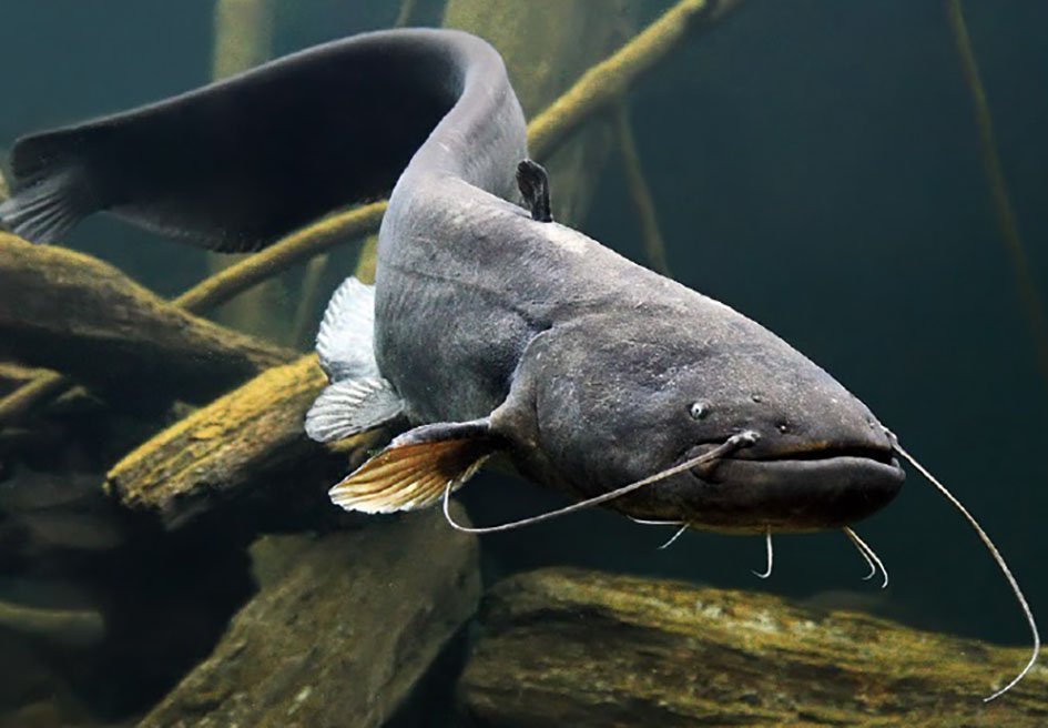 - Le silure, un poisson géant qui peut mesurer plus de 2 mètres. Il est capable de capturer des pigeons sur les rives ! Ce poisson vit notamment dans le Rhône, le fleuve qui alimente le lac Léman. (© Aquatis.)