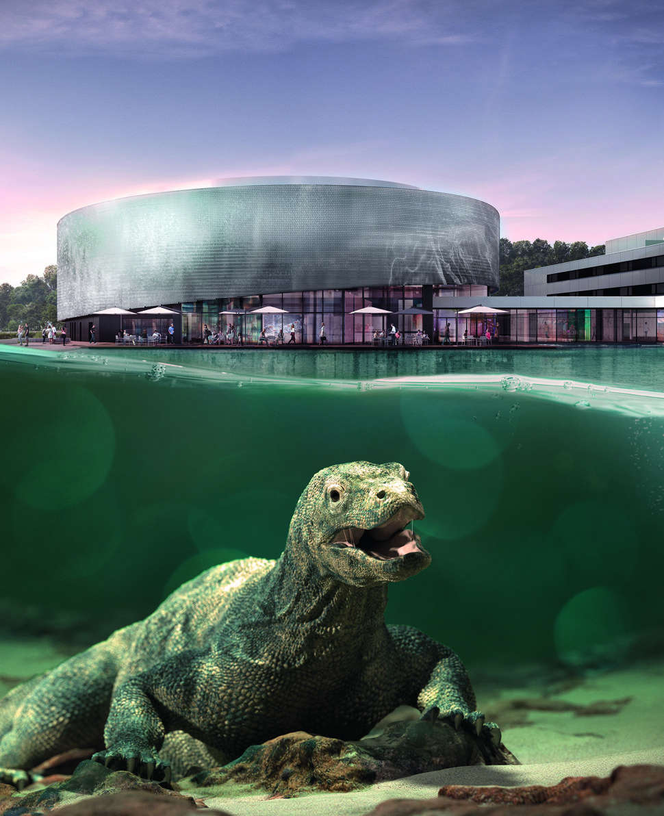 - L’affiche de l’aquarium d’Aquatis : en arrière-plan, le bâtiment qui vient tout juste d’être achevé. Au premier plan Naga, le dragon de Komodo, la star de l’aquarium. (© Aquatis.)
