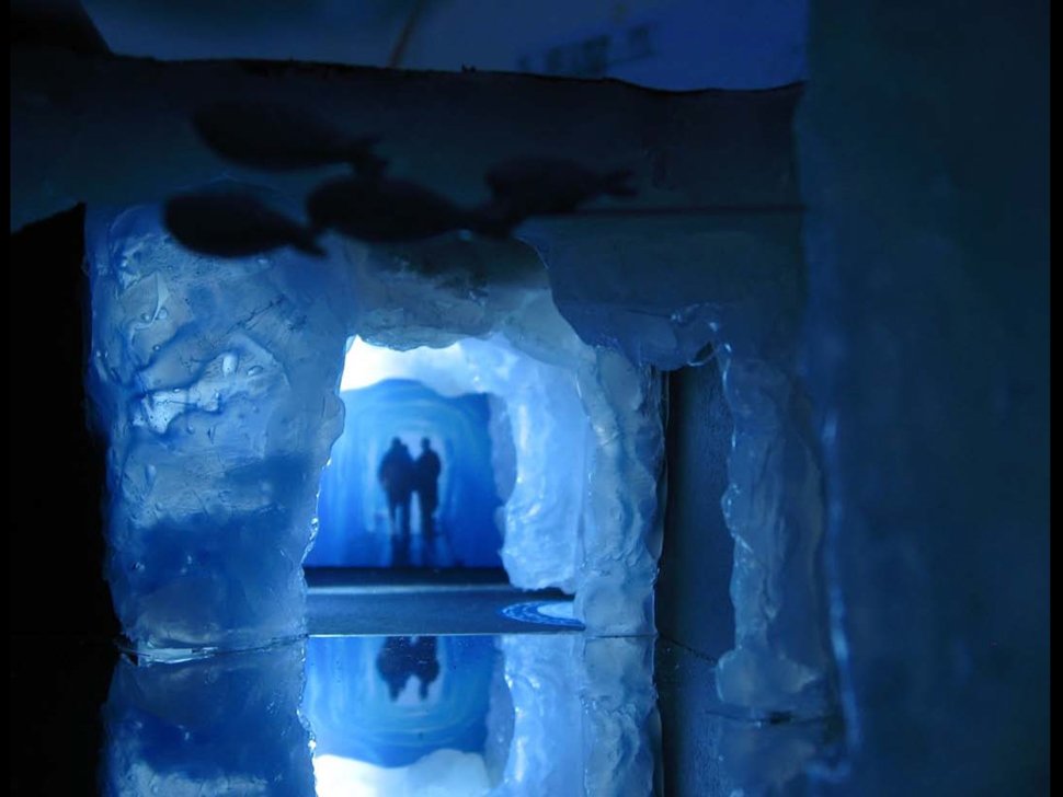 - Dans chaque espace, le visiteur est en immersion dans un écosystème : ici, le milieu alpin a été reconstitué. Une mise en scène montre les conséquences du changement climatique, notamment la fonte des glaciers. (© Aquatis.)
