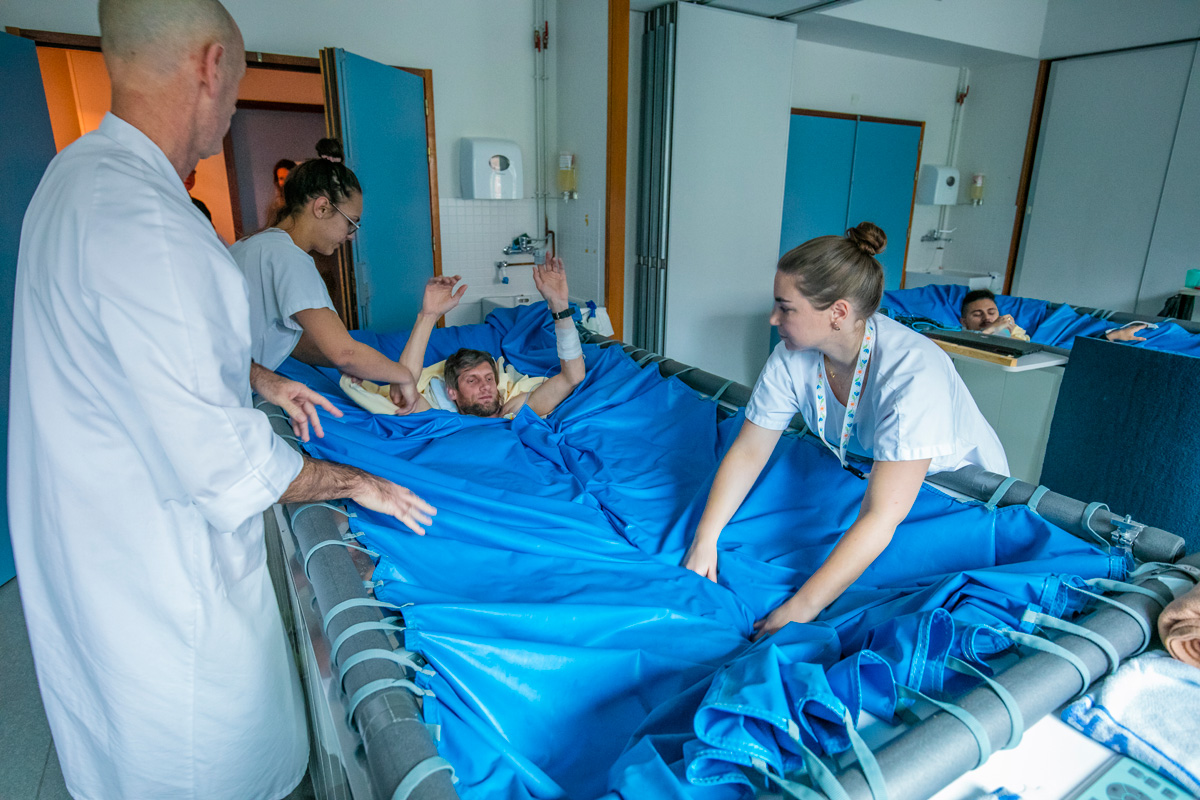 Andréa : D’être dépendant des autres. Comme on doit rester couchés, il nous faut de l’aide pour tout : manger, boire, faire pipi, se doucher… On a des médecins et des infirmières autour de nous en permanence, pendant la journée et même pendant la nuit.