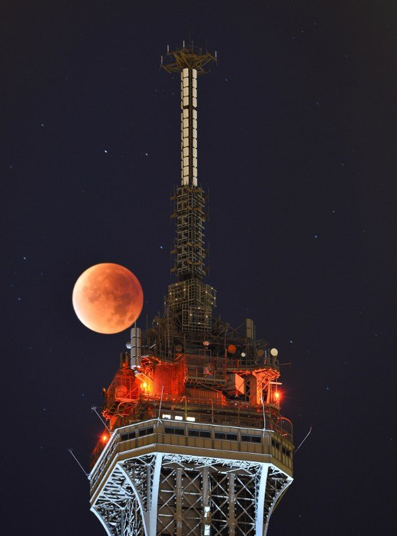 - La Lune entièrement rouge, photographiée à côté de la tour Eiffel. © Mustafa Yalcin / Anadolu Agency/ AFP