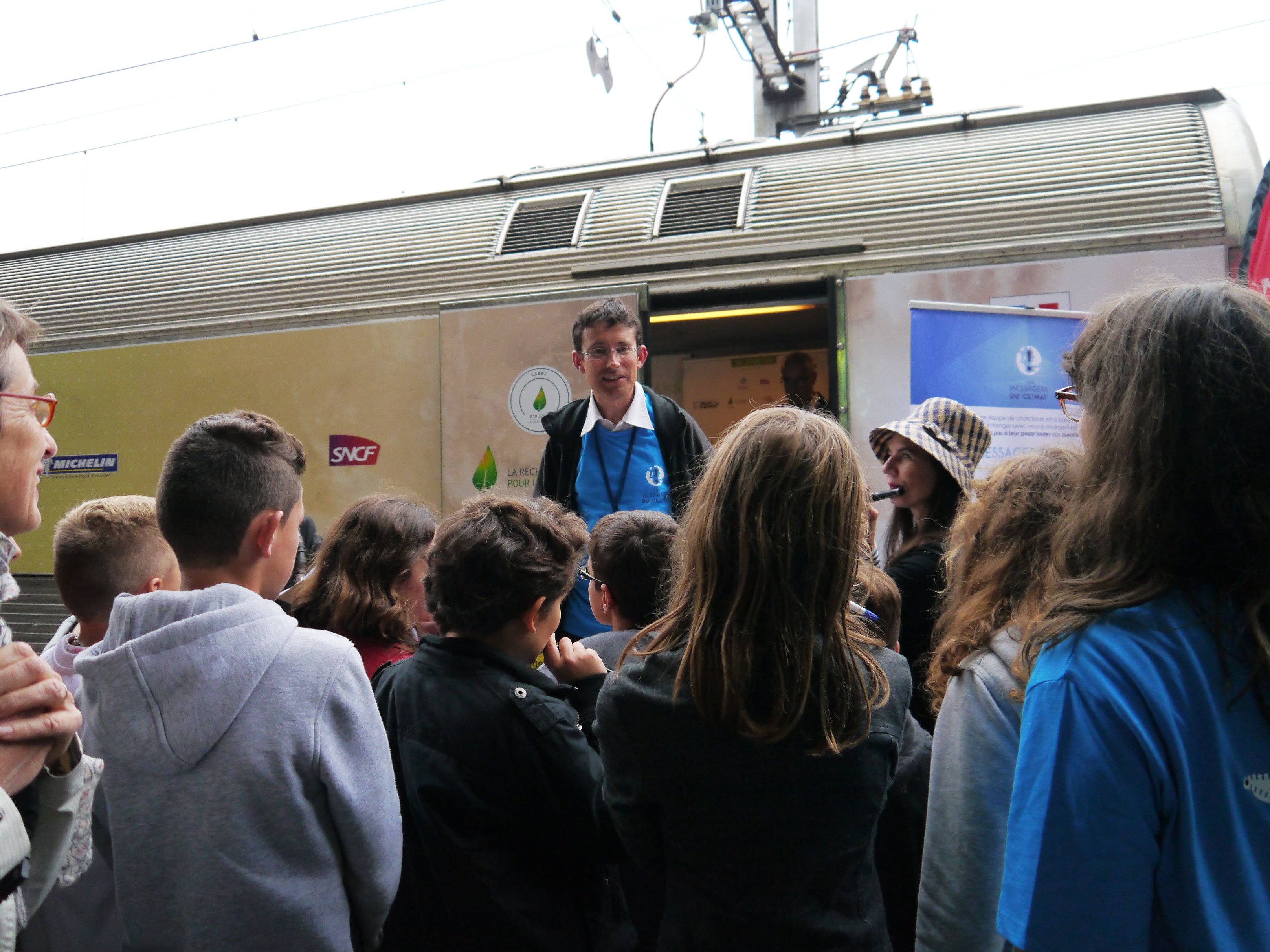Suivis par leur professeur de physique, des élèves de 6e et 5e du collège Bétance à Muret s’apprêtent à monter dans un train très spécial. Au milieu des passagers qui circulent dans la gare de Toulouse, ce mardi après-midi, les cinq wagons sans fenêtres attirent l’attention. Sur un côté du train, arrêté voie 1B, on peut lire en très gros : « Train du climat ». Pas de paysage qui défile par la fenêtre, pas de « tchou-tchou » régulier, ce train invite à un voyage original… Un voyage à la découverte du climat !