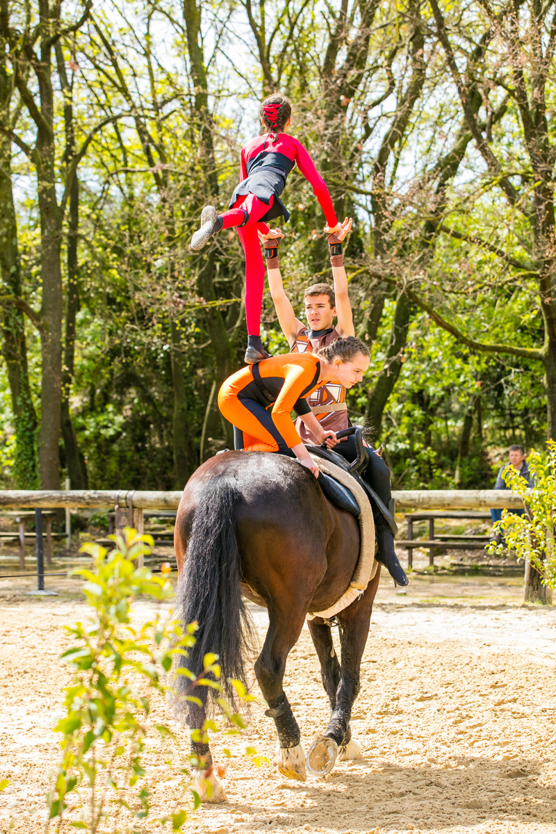 Le cheval est dirigé par un longeur, qui fait lui aussi partie de l’équipe. Il doit connaître par cœur la chorégraphie des voltigeurs, pour guider le cheval à la bonne allure, au bon moment.