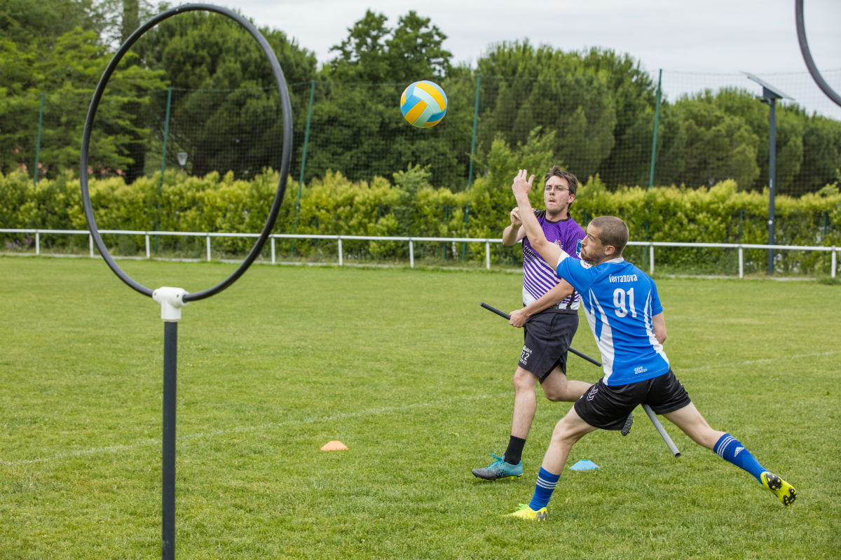 Les joueurs s’entraînent au rôle d’attrapeur : l’équipe gagne dix points lorsque le ballon passe dans un des cercles de l’équipe adverse. (© Vincent Gire / Milan Presse)