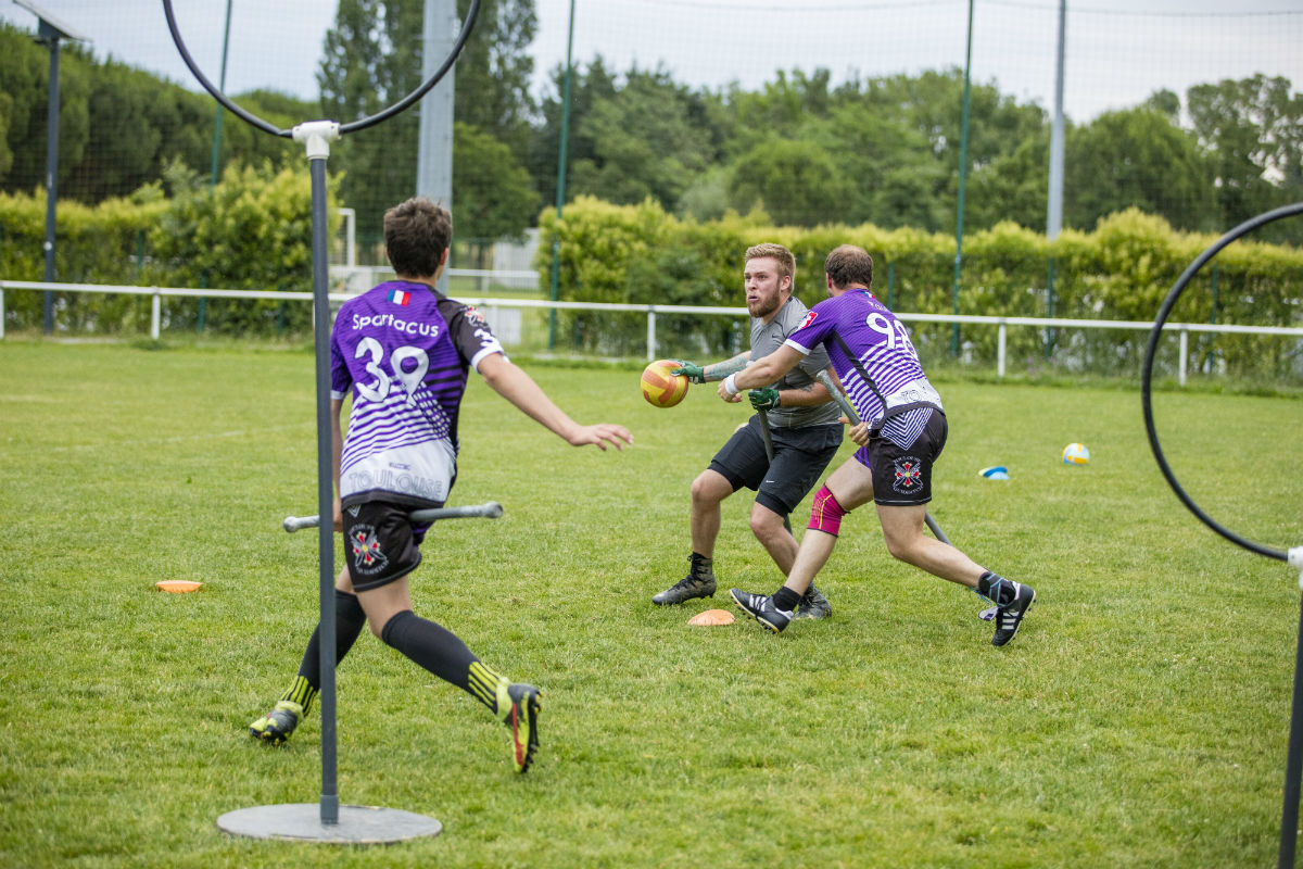 Dans Harry Potter, les cognards volent. Dans notre monde de moldus, ce sont les batteurs qui lancent des balles violettes, pour éliminer les joueurs adverses. (© Vincent Gire / Milan Presse)