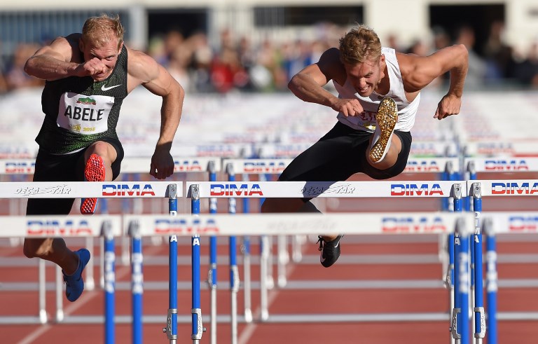 - La sixième épreuve du décathlon est le 110 mètres haies. Kevin Mayer est à droite, en blanc sur la photo. (© Nicolas Tucat / AFP)
