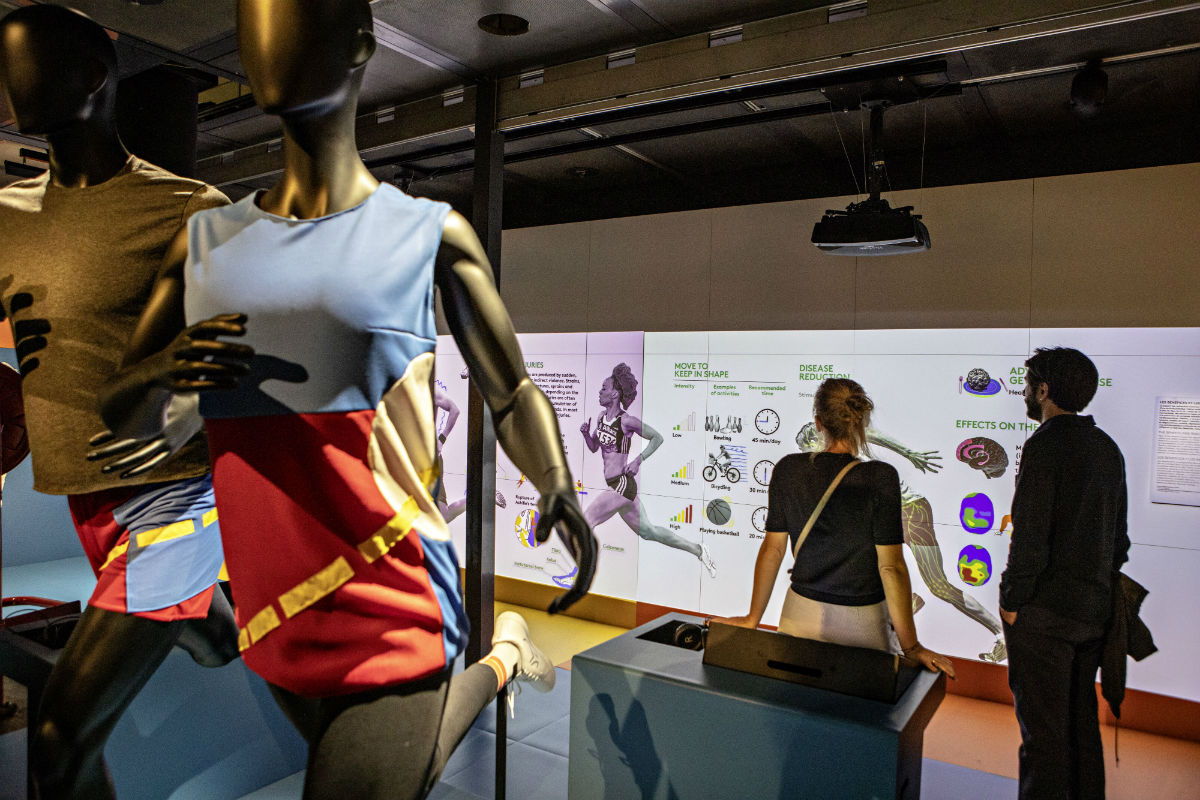 Contrôle de ballon sur un parcours clignotant, murs d’escalade, punching-ball futuriste : transformée en un grand tapis de sport, l’exposition t’invite à tester tes compétences. Un radar peut même calculer la vitesse de ta frappe dans une balle de tennis !